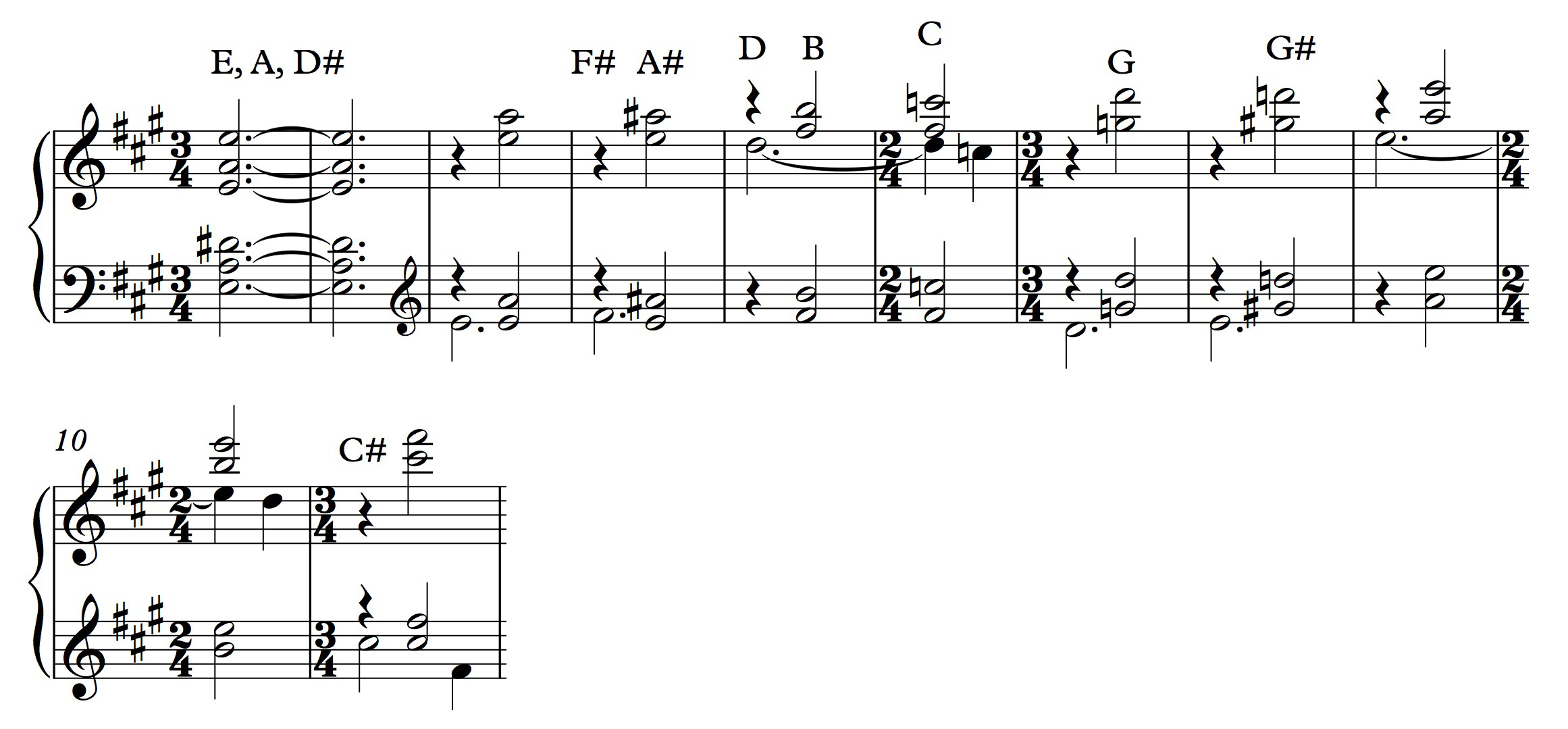 By the time the second movement gets to the downbeat of measure 11, we’ve heard 11 of the 12 pitches of the chromatic scale. You’re left waiting for the 12th pitch, the F-natural, to complete the aggregate. And it doesn’t show up. Not at first, anyway. But when the movement shifts over to Psalm 2, with the nations raging so furiously together, the tonality shifts to A-minor—and that F-natural shows up almost immediately: